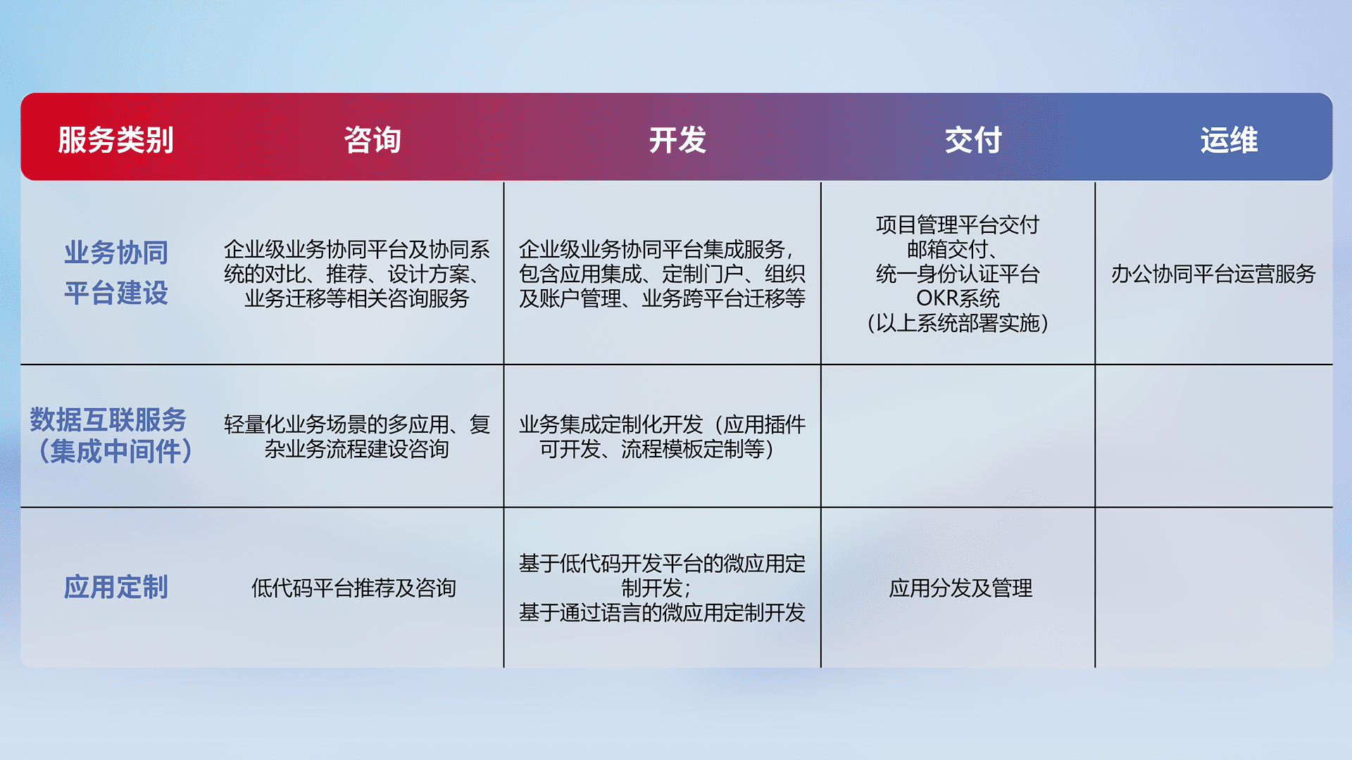 针对钉钉、、、企微、、、、IDaas等平台级产品提供产品的规划、、、方案、、、交付、、定制化开发等服务,,,,实现如统一协同办公、、、智能客户服务、、、、混合会议管理、、、智能数据查询、、等业务场景,,实现数字化转型。。。
