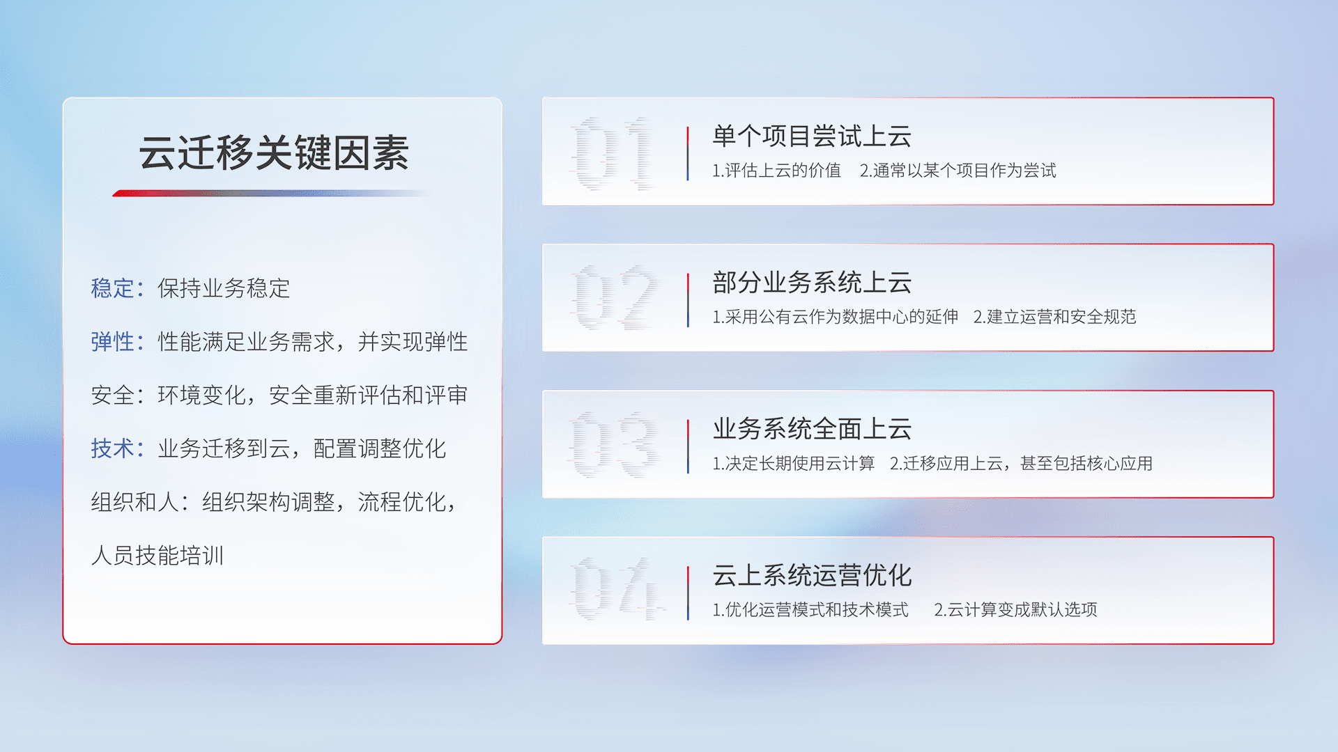 结合实际业务,,从规划设计、、、、云平台选型、、、云原生改造、、、数据迁移、、、、集成交付,,,,迁移全过程为客户识别最佳上云路径,,做好风险识别管理,,,设计网络架构、、身份权限、、安全审计合规、、操作审计、、、、日志审计、、、、监控告警策略、、、多站点容灾设计等,,,,对云上基础设施进行整体规划,,提升IT治理水平,,以满足弹性、、、、高可用、、、高性能的需求。。。。