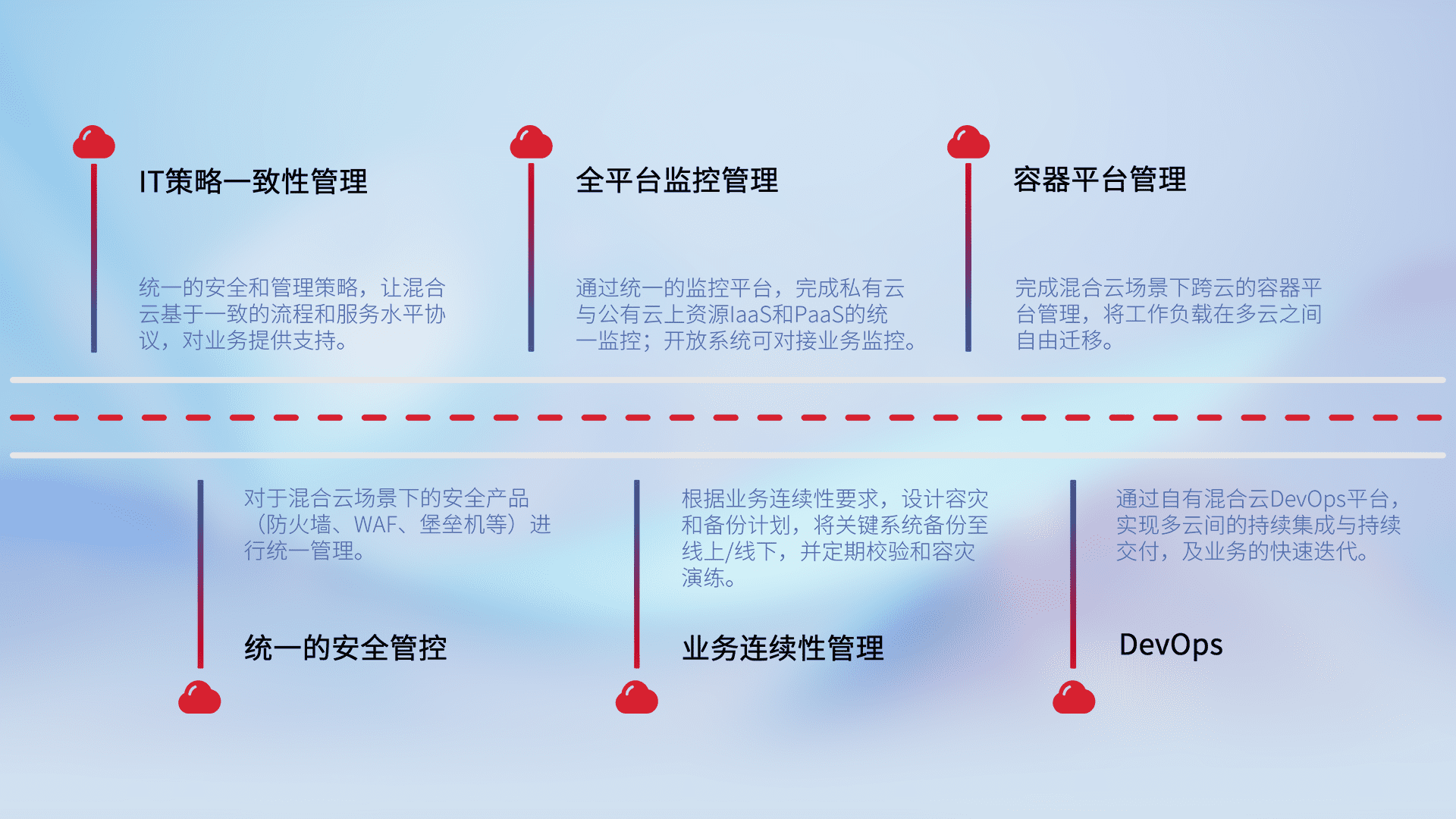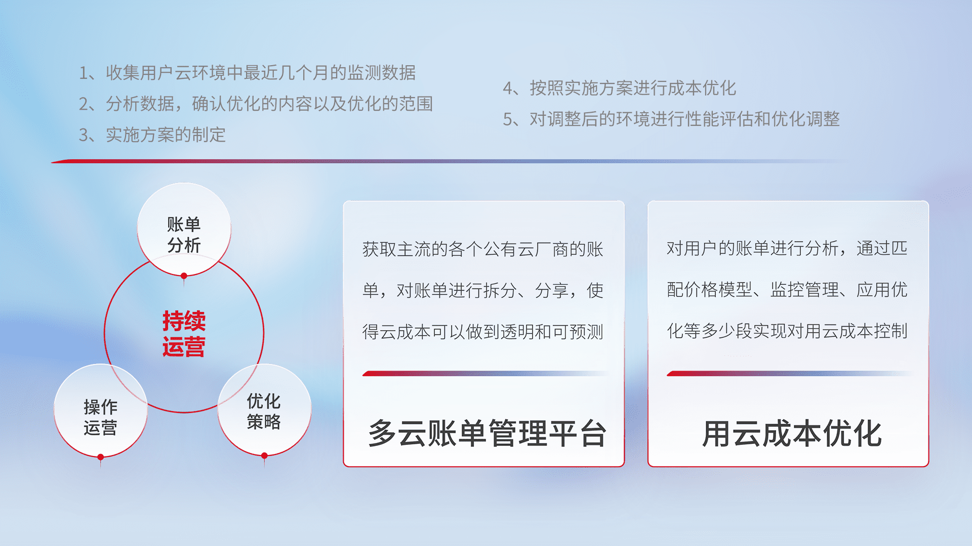 通过多云纳管,,,以统一的资源数据模型把客户的云资源进行抽象和封装,,进而实现对多云资源的统一操作,,,保障云资源管理的可靠性、、、稳定性与可用性。。量身定制化运维内容,,,配置、、、开发运维、、、、补丁管理、、、、备份、、、监控、、、、认证和访问管理、、审计和日常巡检等,,,保障在用云过程中的可靠度,,,,稳定度以及高可用率。。。